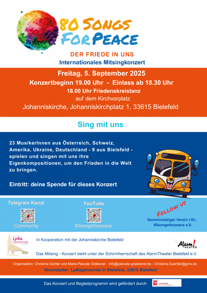 Mitsingkonzert Veröffentlicht am 20. August 2025 5.9.: Bielefelder Friedenslieder-Mitsingkonzert von Christina Gürtler